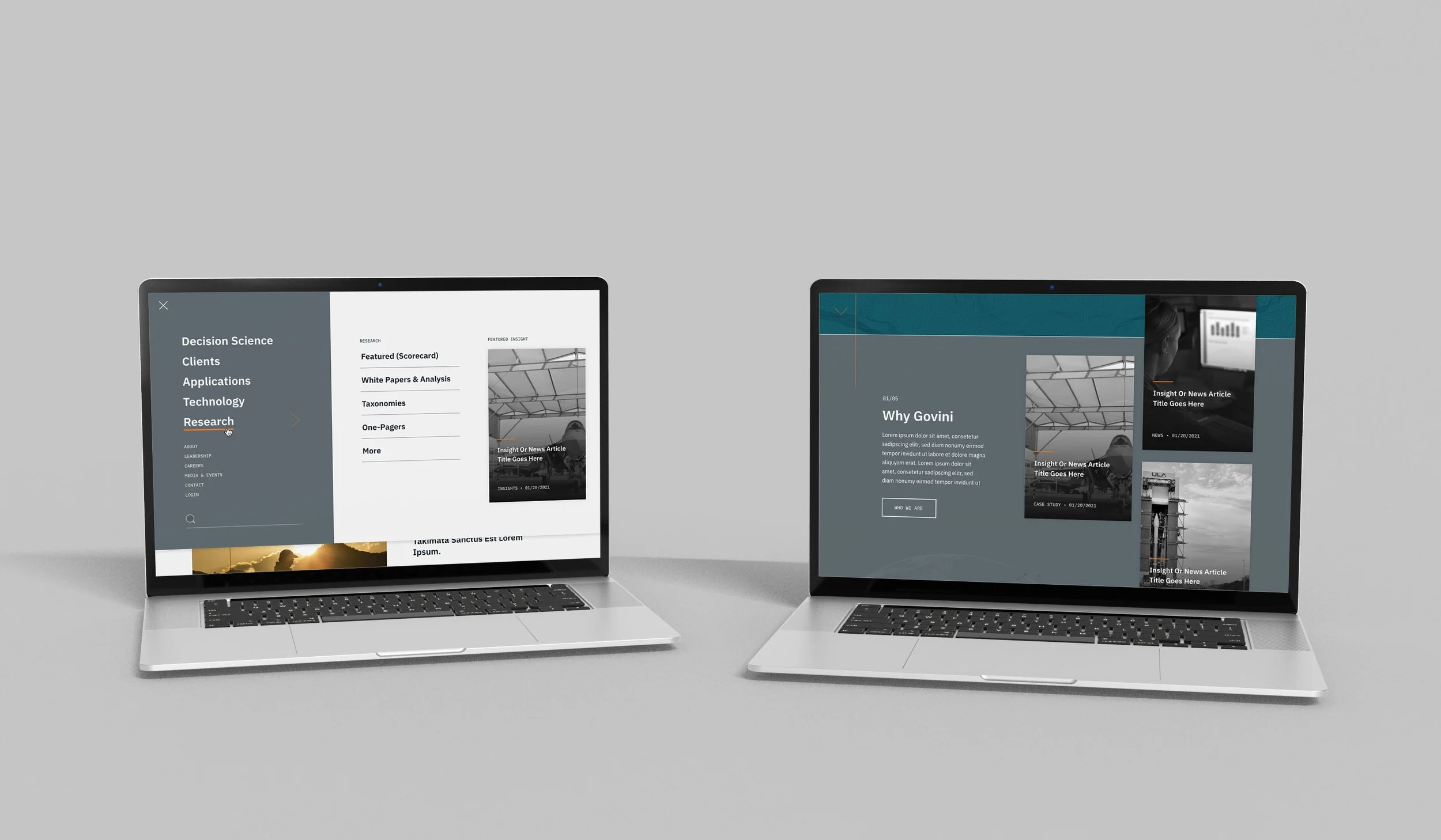 Once we established the tone and creative characteristics in the mood board phase, I moved into the web design portion. I wanted to create a long-form home page with animations based on scroll math and hover effects to offer interest to the various sectors and projects that Govini boasts. The internal pages continued with full bleed photography and content components that could easily assemble a page full of content into digestable buckets via the content management system.